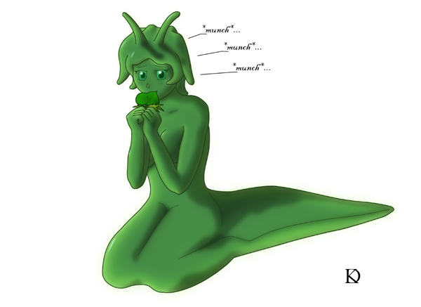 This is one of two pictures sketched out over the summer of 04 while in Canada. While the other was based on this concept this was the start of the idea, inspired while on a walk through some temperate rainforest. This rather large slug (we don't get them that big here in England) was just sitting on a log eating its way through some small sprouting leaves and, bizarre as it may seem, the little thing looked quite adorable. For a slug that is. It's the first time I've ever seen a slug's mouth. Anyway, that was why I attempted to draw a picture that embodied the idea of 'cute slug' and so the Cute Little Slug Girl was born. The shading and gradiated colouring took quite a while, but I ended up pleased with the result.